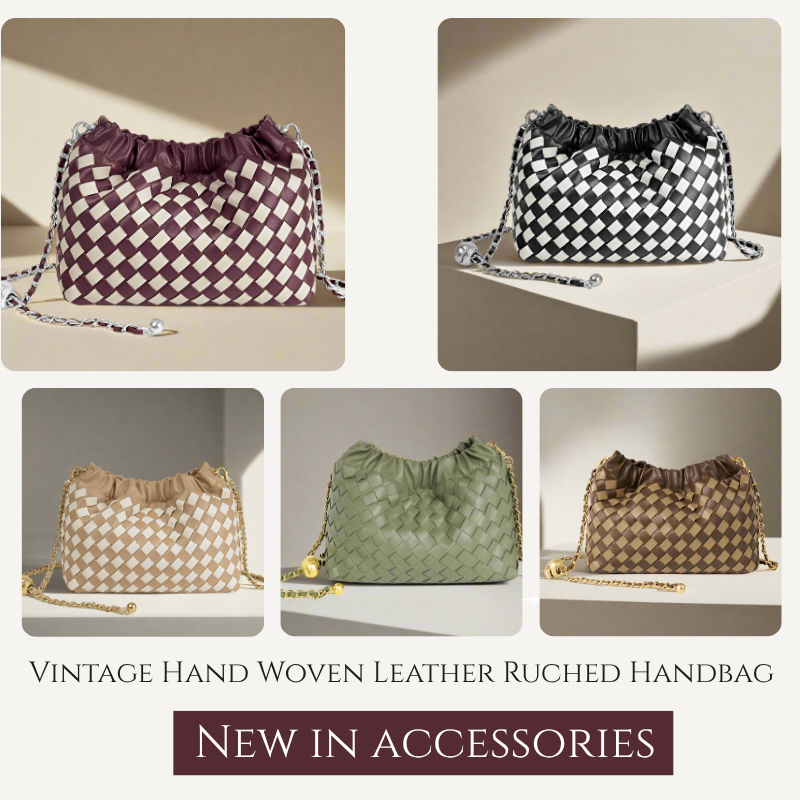 Vintage Hand Woven Leather Ruched Handbag| Ash Olive & White