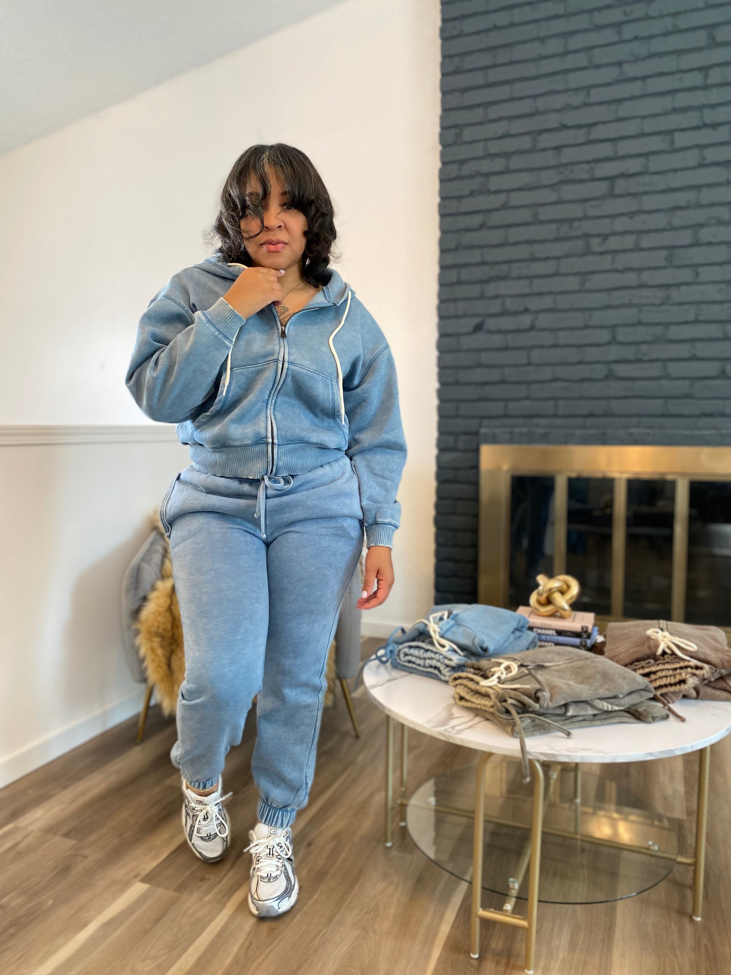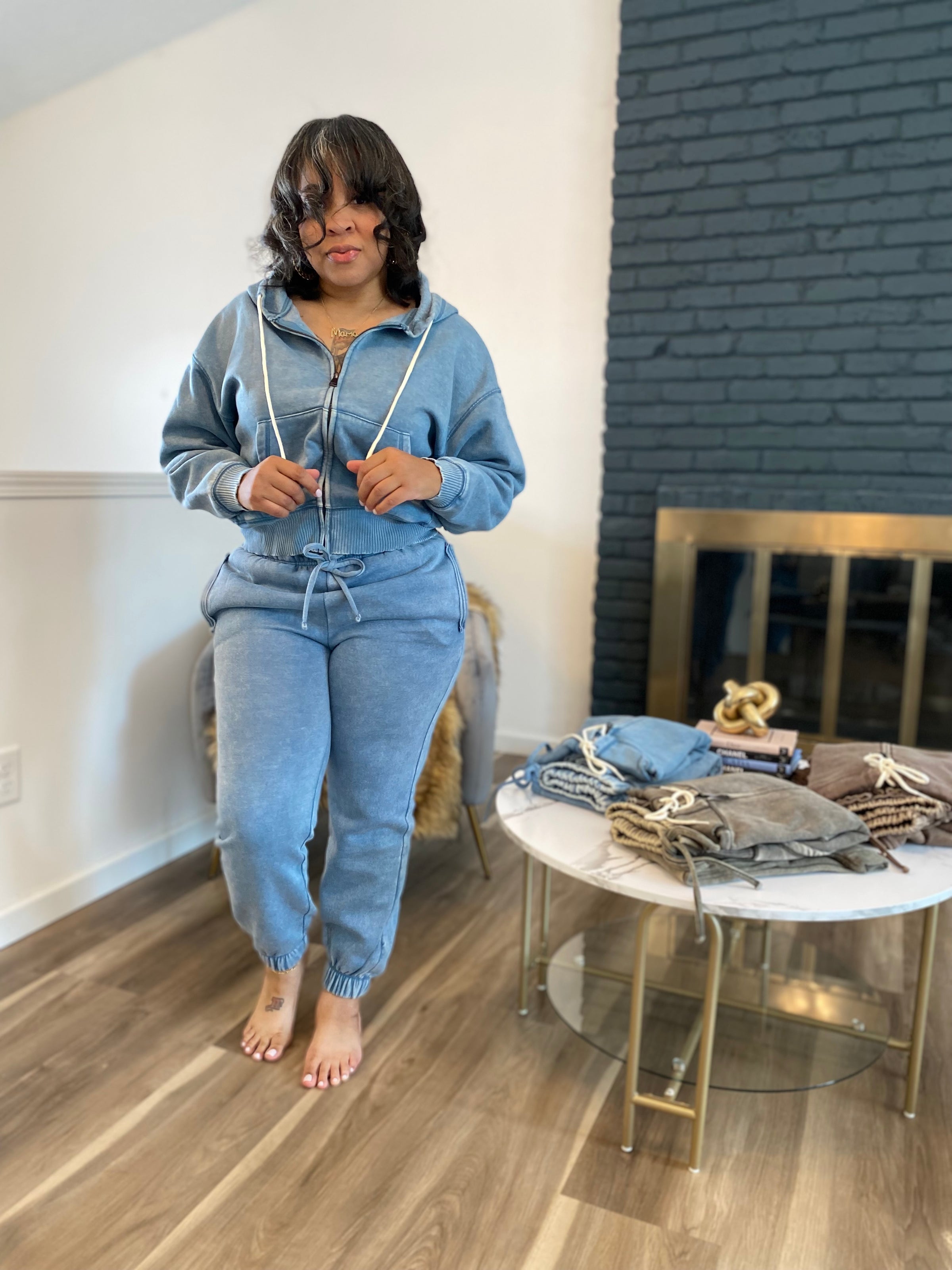 2PC Acid Wash Hoodie Jacket Jogger Set| Blue Grey