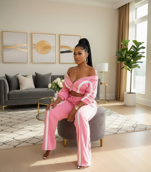 Colorblock Zipper Sweatshirt Pants Set| Pink