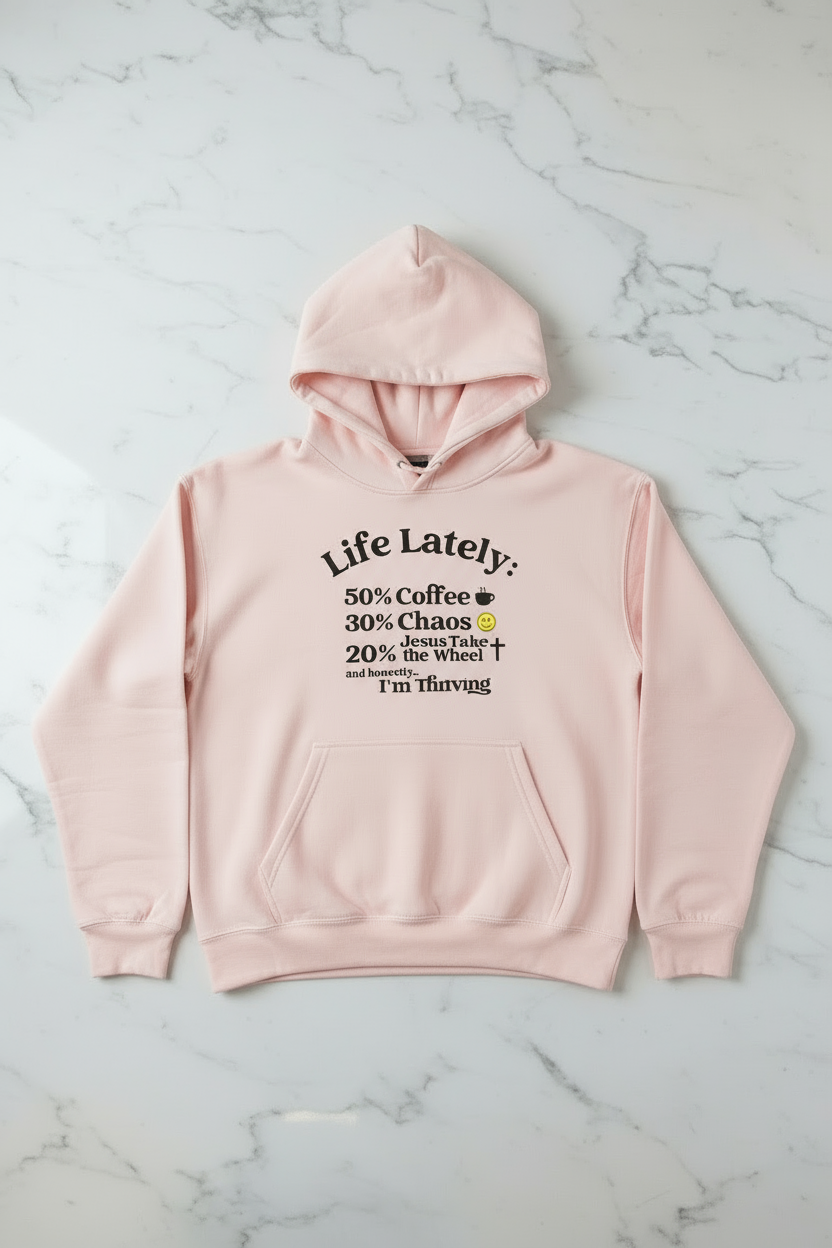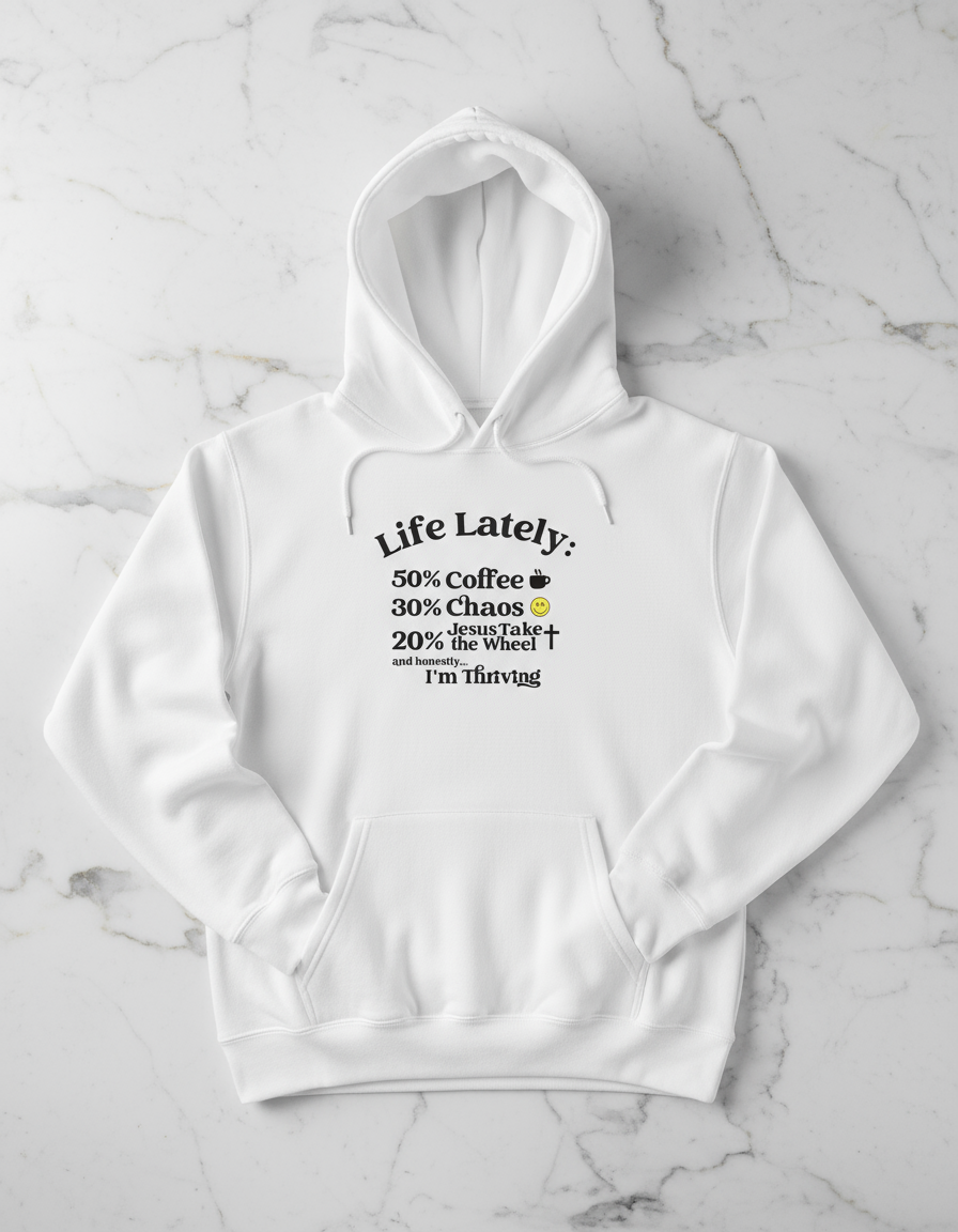 Elevate your mornings with the "Life Lately Coffee Chaos Jesus Hoodie." Crafted from high-quality, substantial, and supremely comfortable material, it's ideal for the colder months and tailored to those who balance daily challenges and find peace in faith.