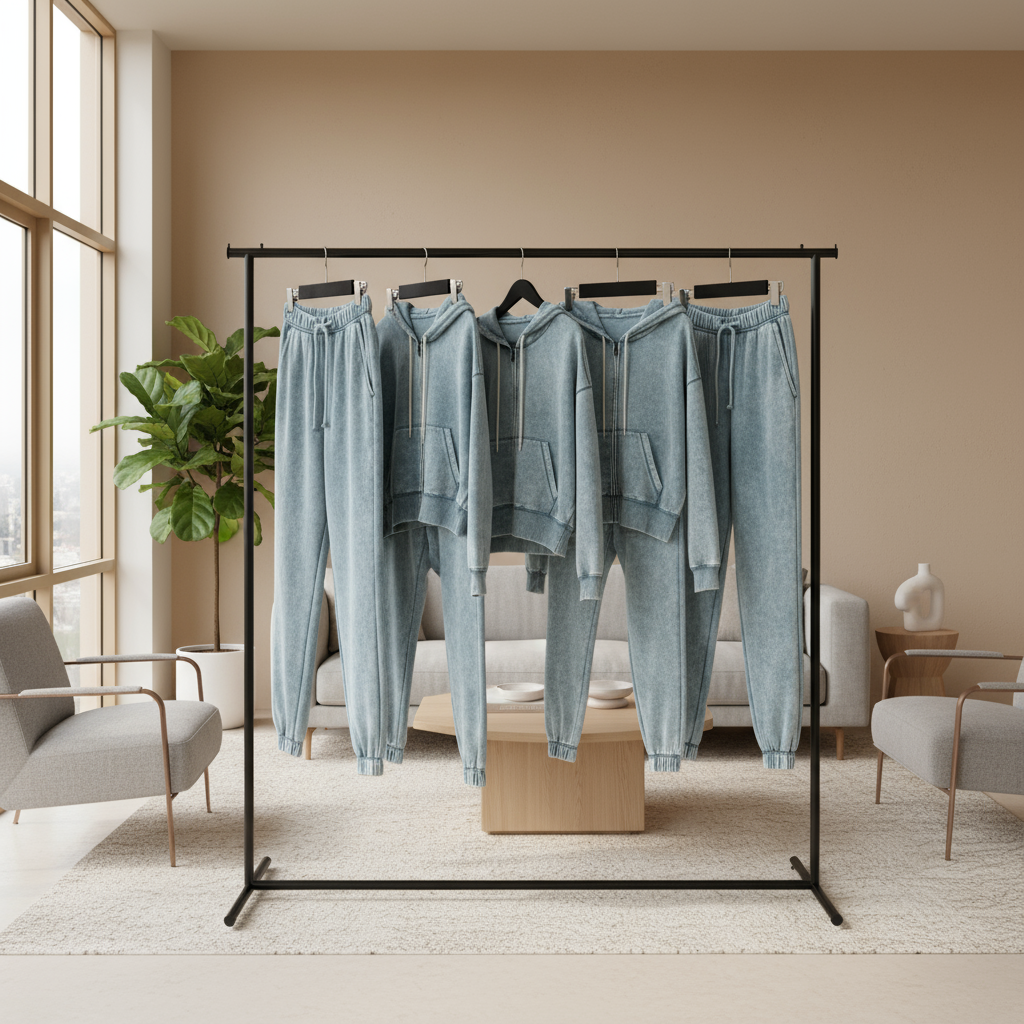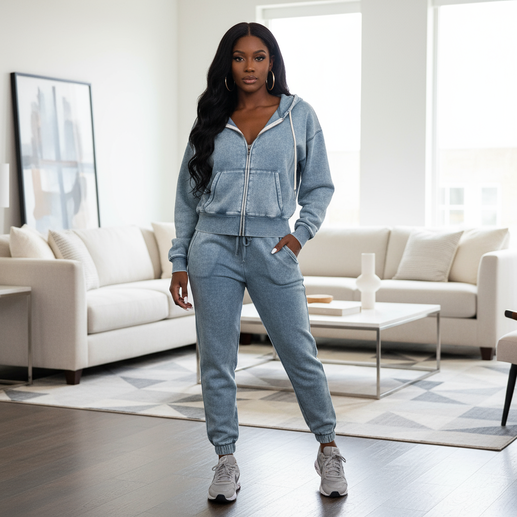 2PC Acid Wash Hoodie Jacket Jogger Set| Blue Grey