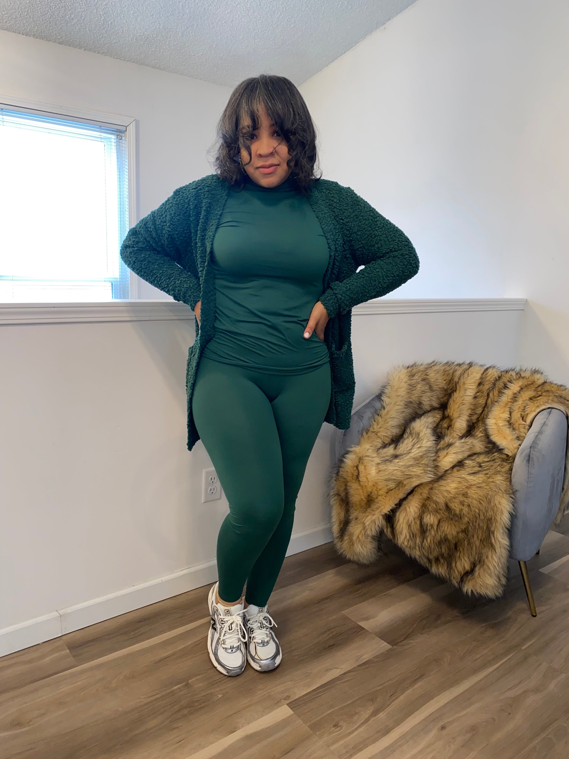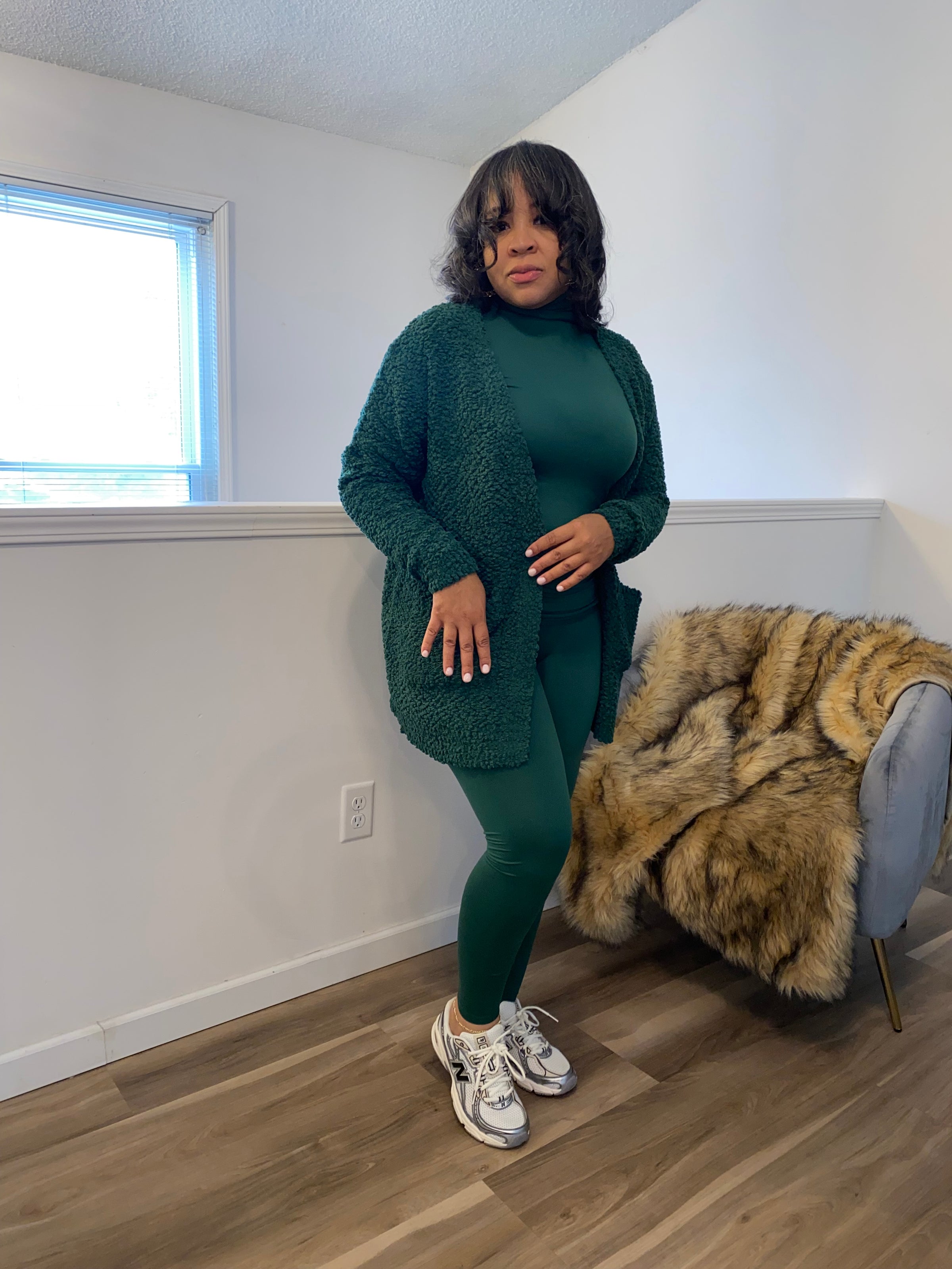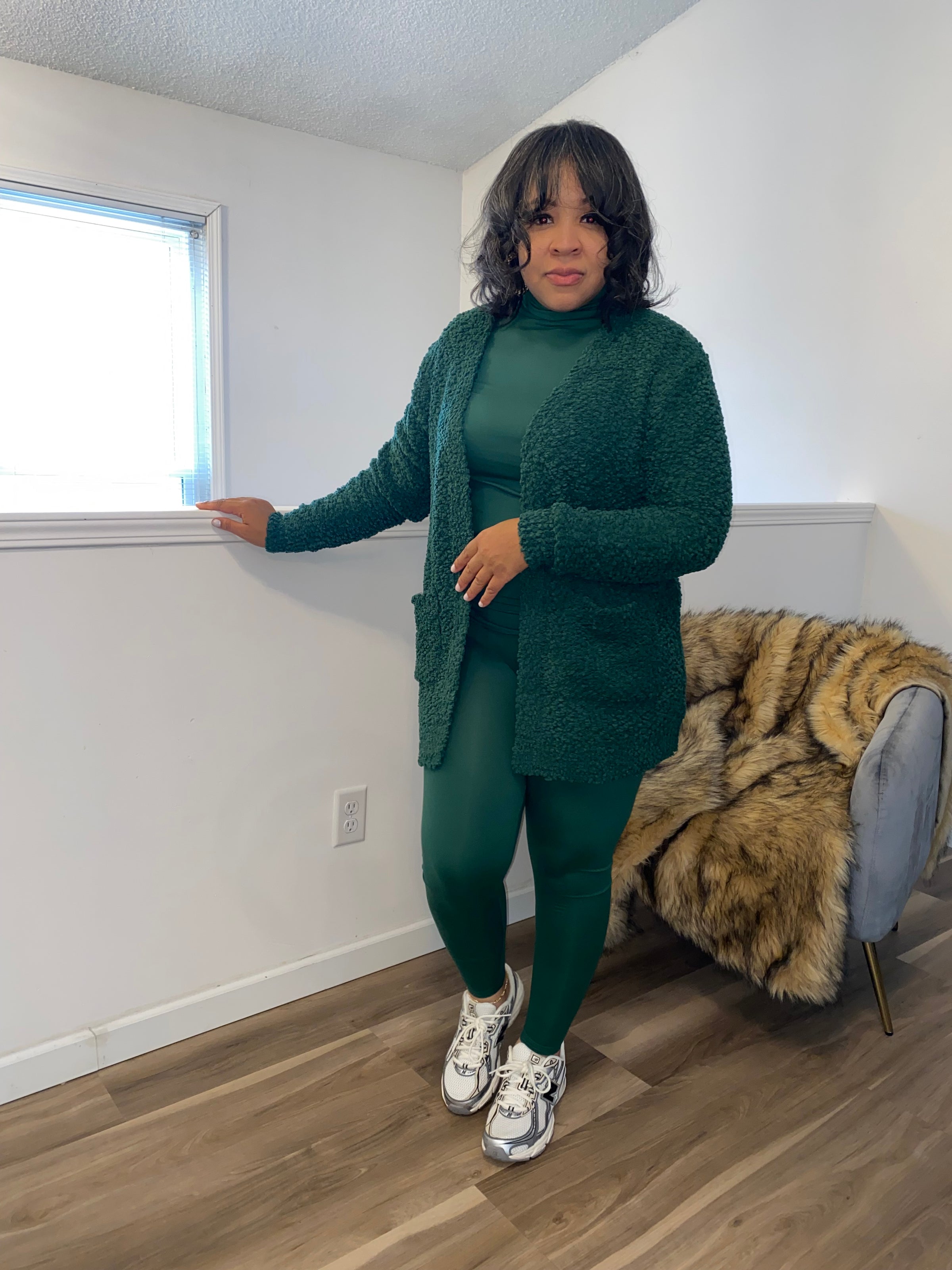 3PC Popcorn Cardigan Turtleneck Legging Set|Green