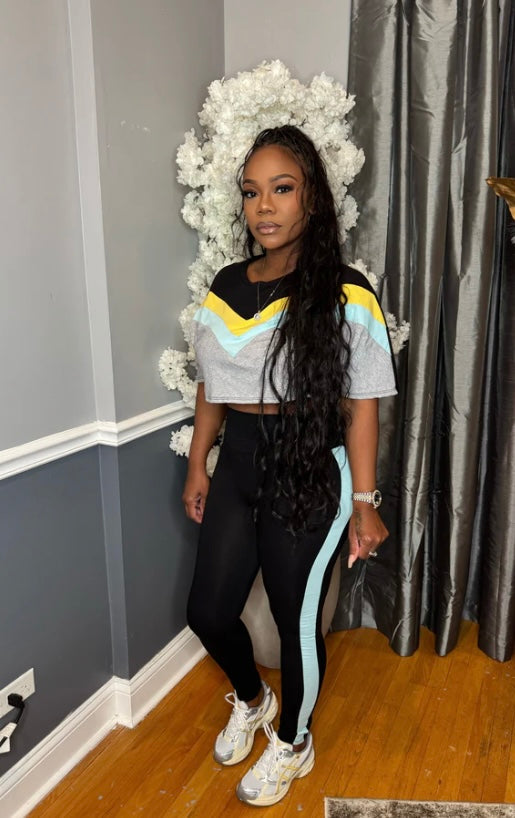 Turn everyday moments into a runway with the “Glow Up Color Block Set.” Featuring a cropped top with bold, playful stripes and matching high-waist leggings, this set delivers all-day comfort with a punch of color. Whether you’re stepping out in sneakers or leveling up your look, this fit guarantees you’ll shine bright.