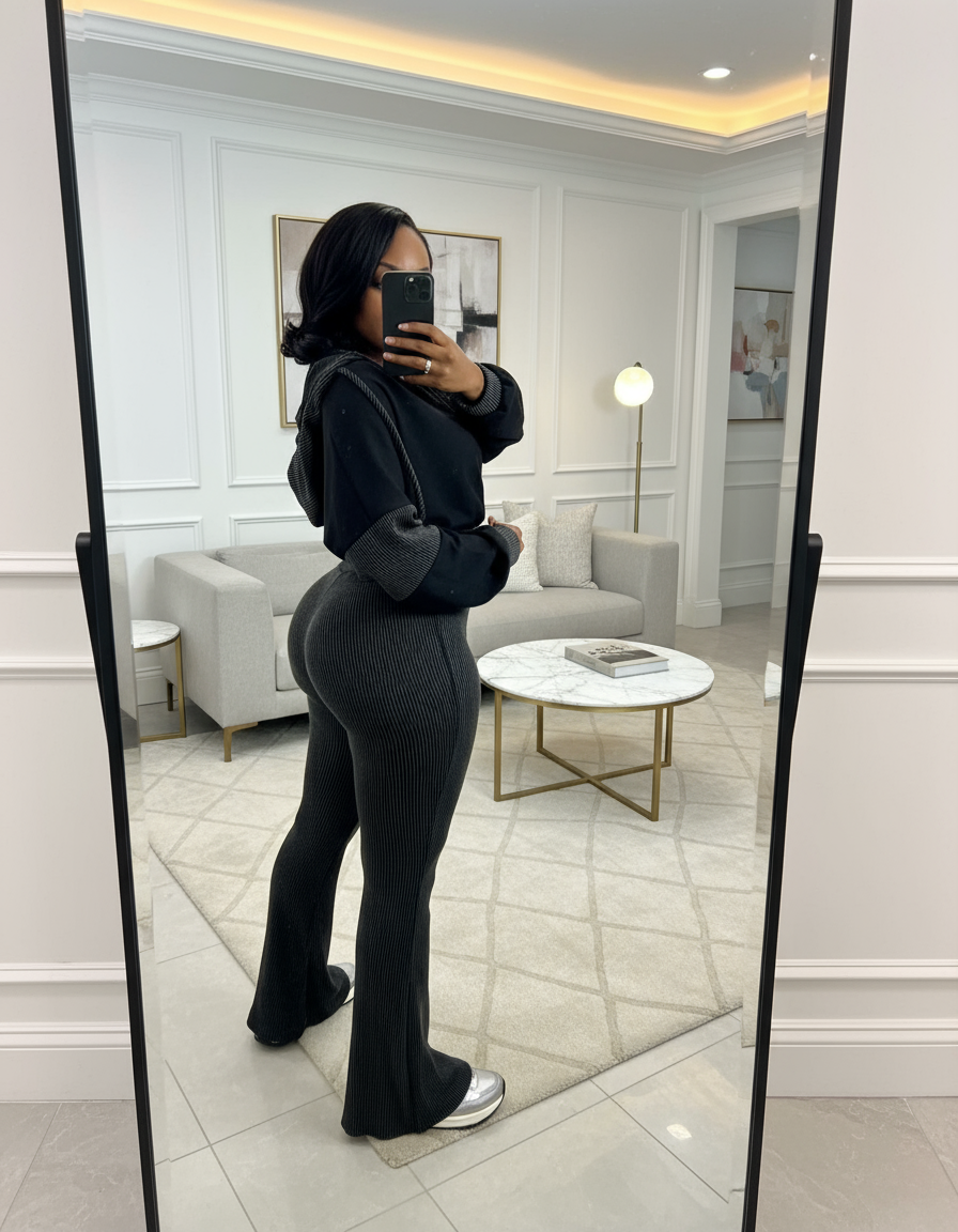 Luxe Hooded Zipper Jacket Flare Pants Set| Black