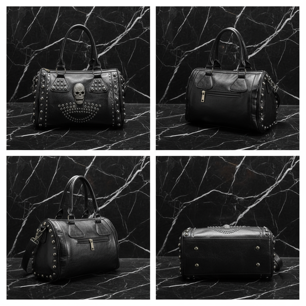Discover our "Rockstar Studded Leather Handbag" for the ultimate edgy punk rock style. Crafted with soft washed synthetic leather, this skull bag features a durable zipper, stunning studs, and unique skull hardware. It can be carried by the top handles or worn with the detachable and adjustable shoulder strap.